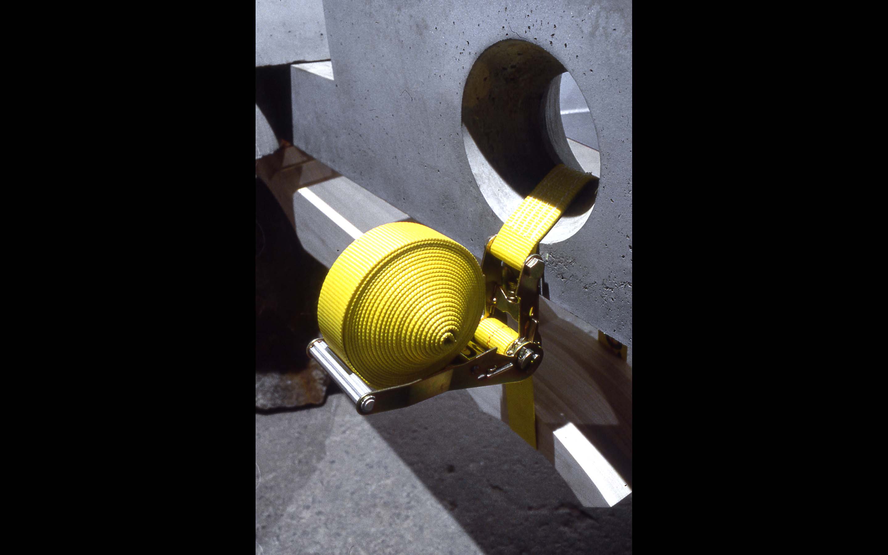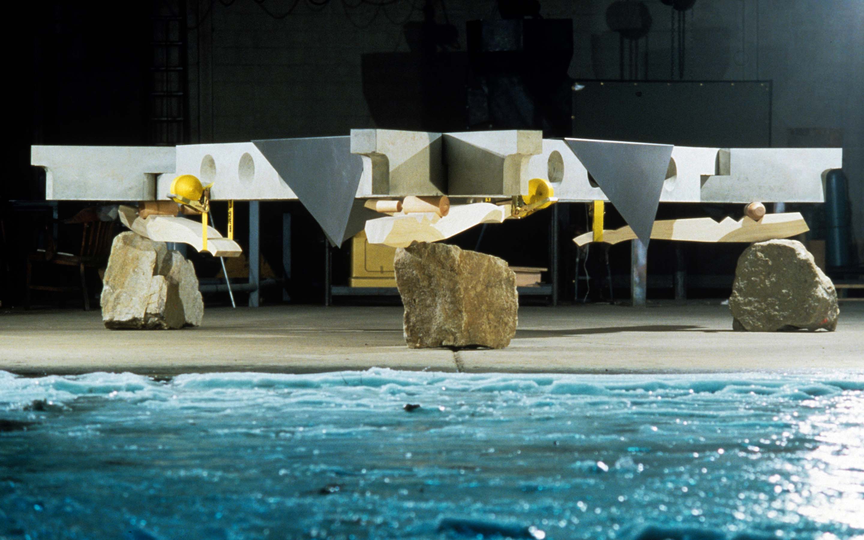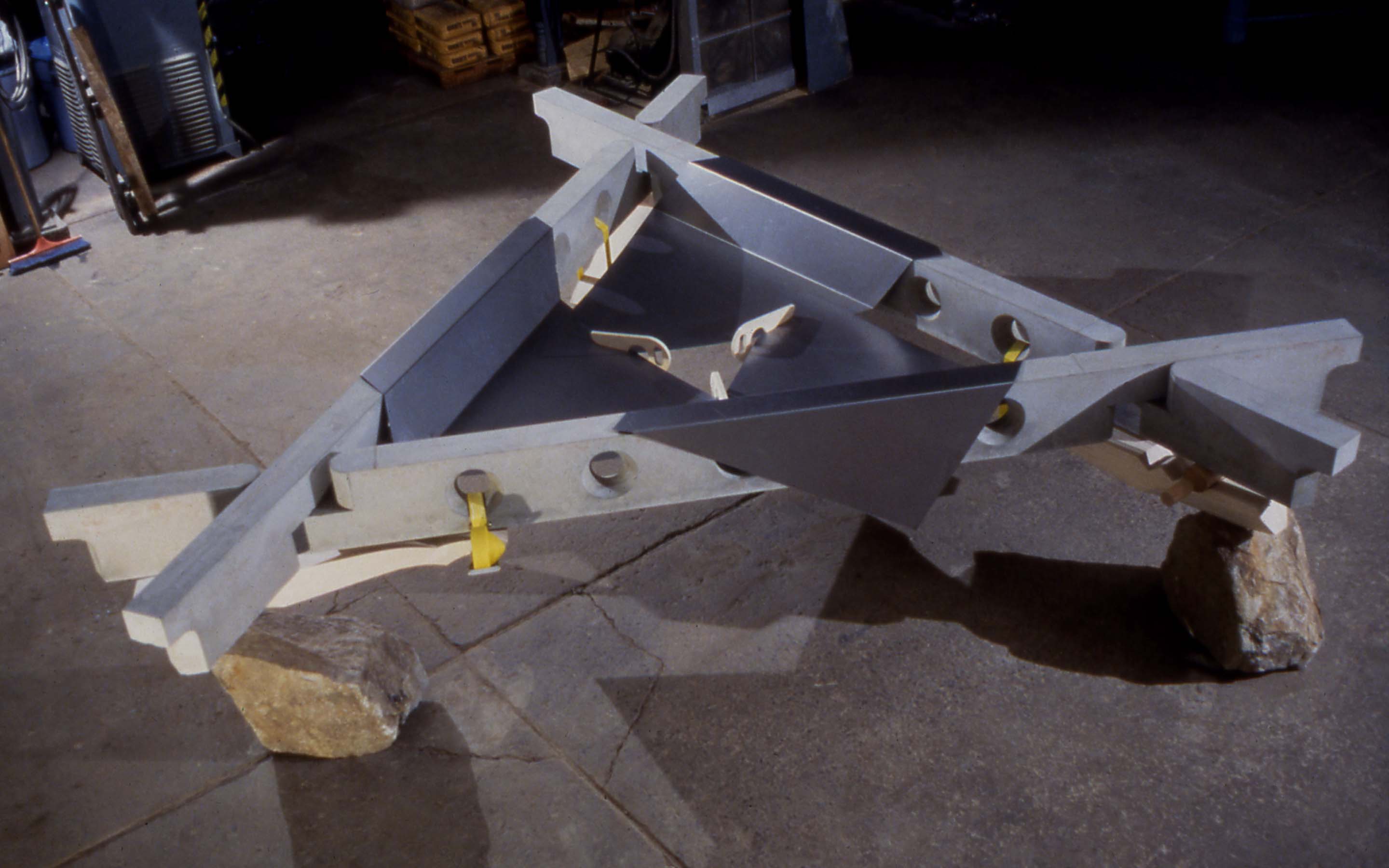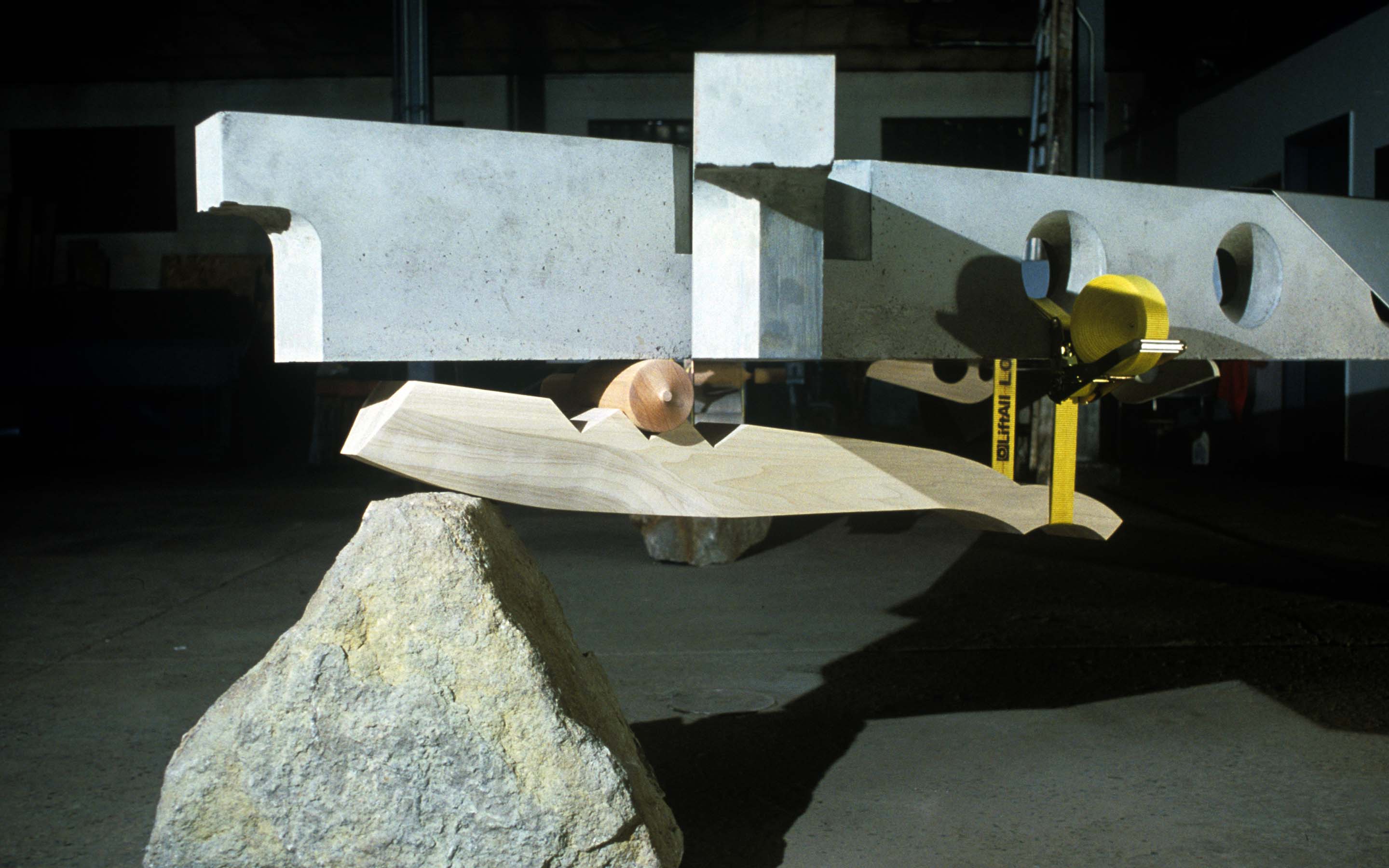 Primitive Huts, 1999. A study in basic methods of assembly (stacking, nesting, interlocking) configured as a reinterpretation of the Vitruvian archetype. Dimensions: 186 x 186 x 55 inches. Material: concrete, wood, aluminum, nylon, boulders. Studio oversight: Jonathan Kirk (Sculpture Space).