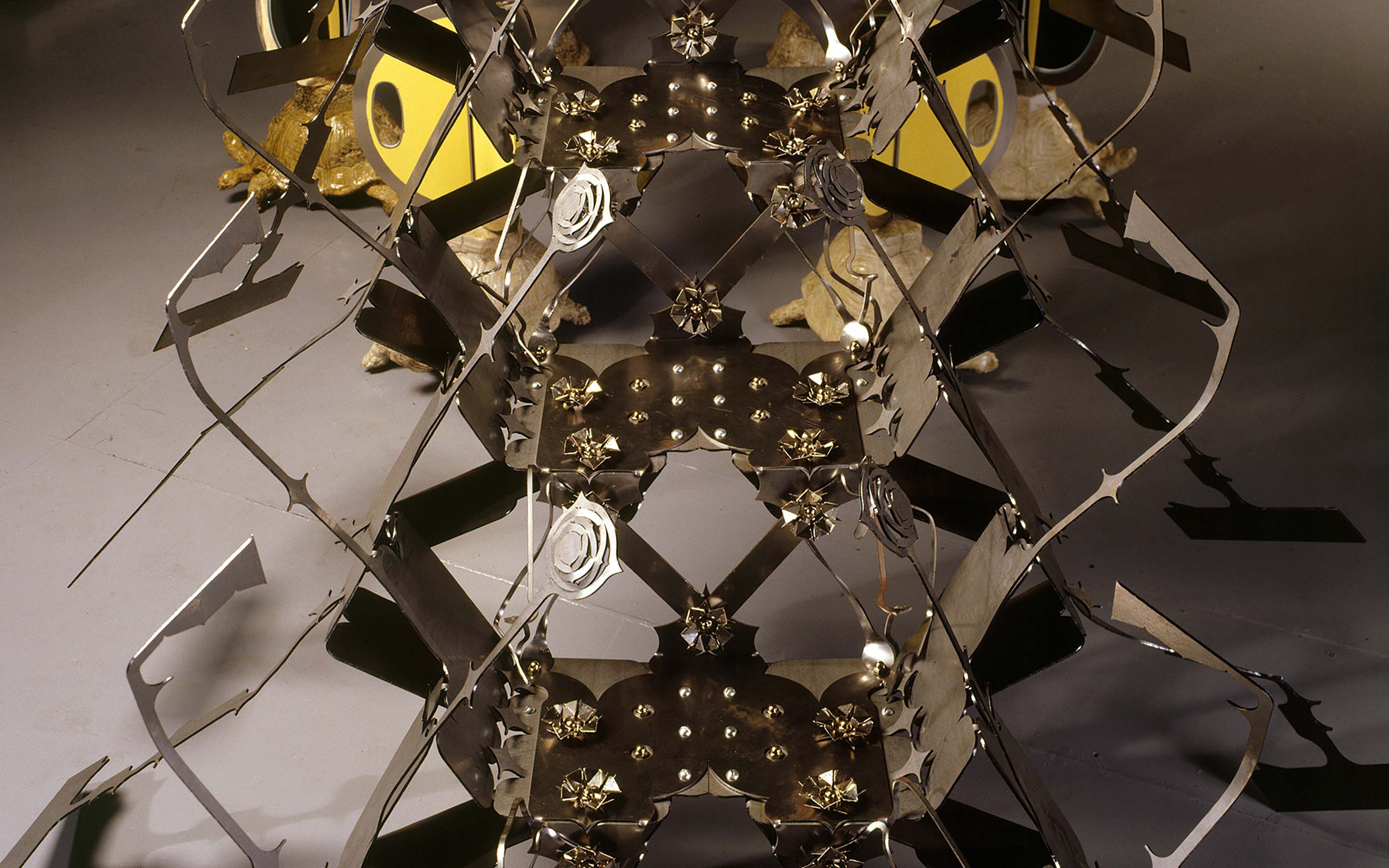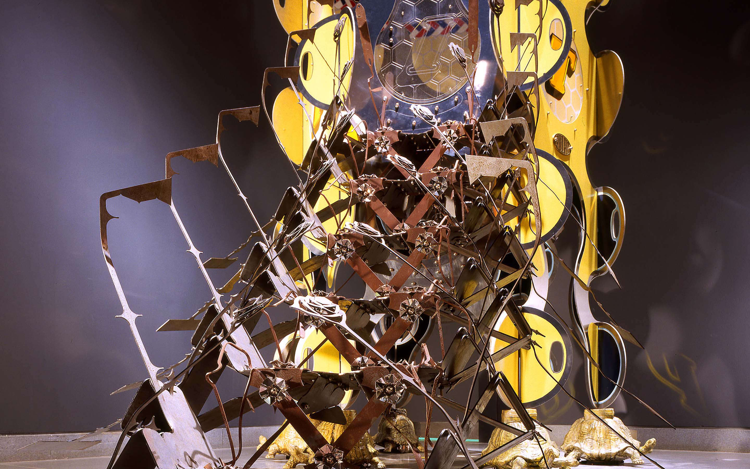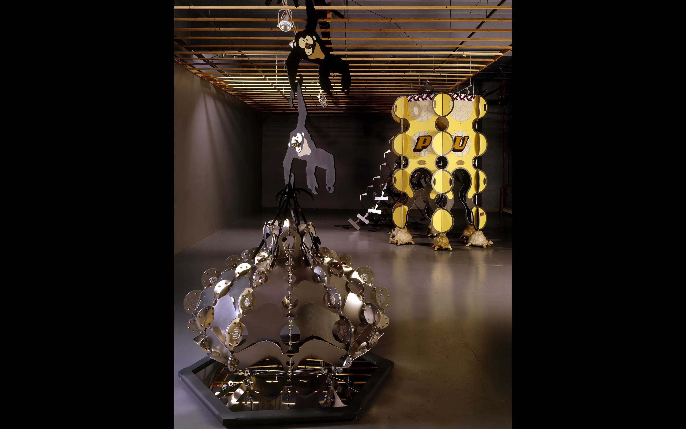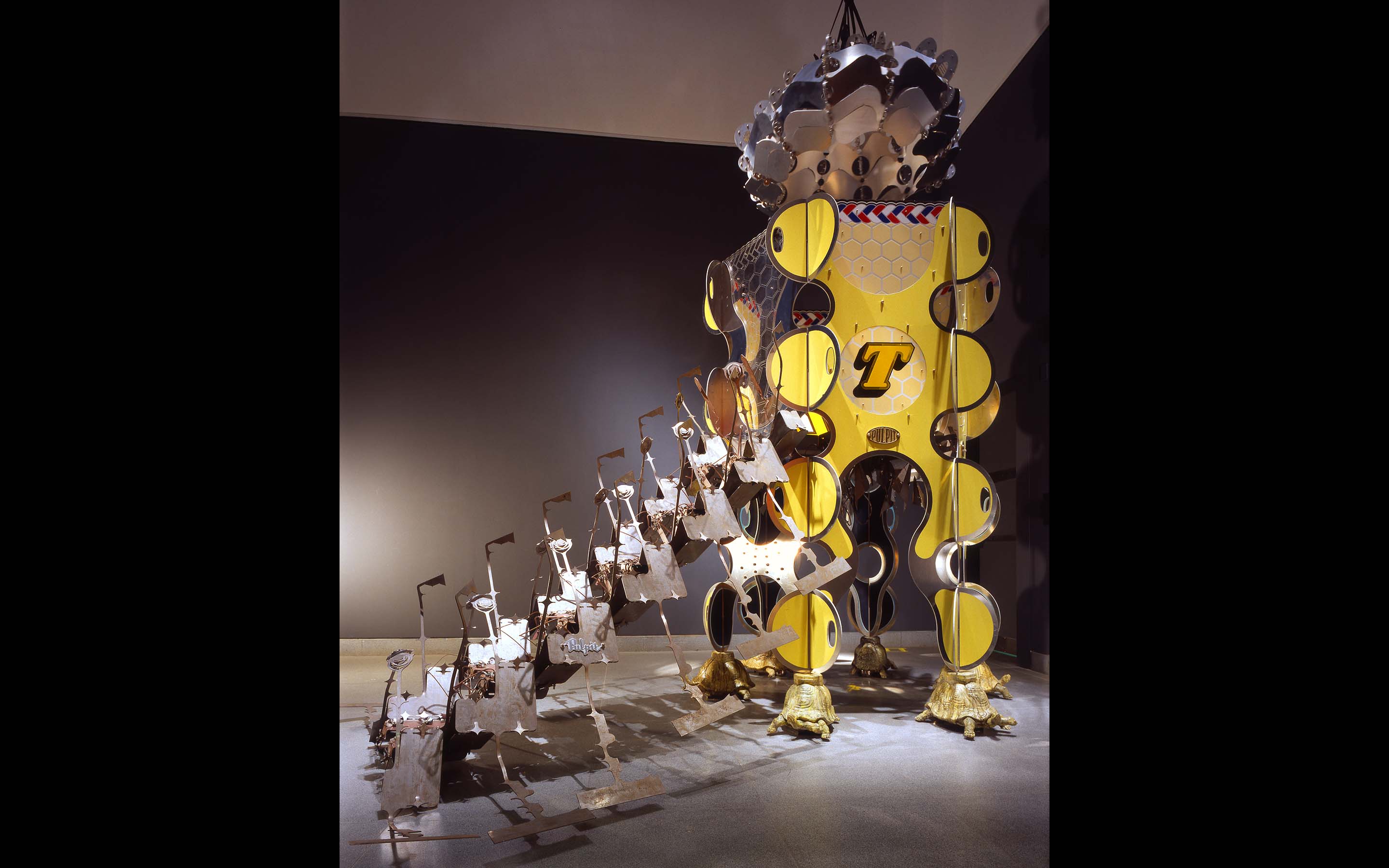 Pulpit, 2002. Installation curated by Marian Griffiths for exhibition at Five Myles in Brooklyn, NY. Dimensions: 70 x 136 x 297 inches. Material: steel, aluminum, bronze, neoprene, plastic, concrete, ceramics, paint. Lead assistant: Ian Patrick. Assistants: Andrew Chan, Erik Benson, Harold Jensen, Josh Kaplan, Frank Parga. Turtle Modeling: Brian Maugham. Photography: © Lydia Gould Bessler.
