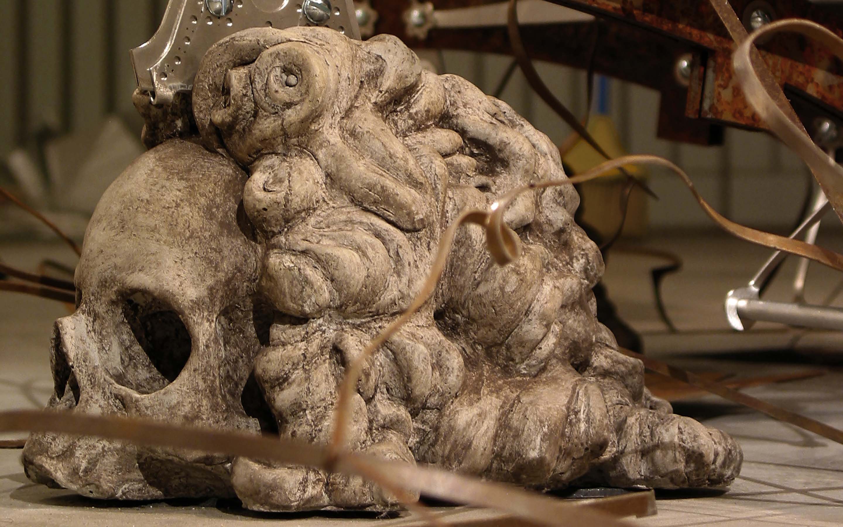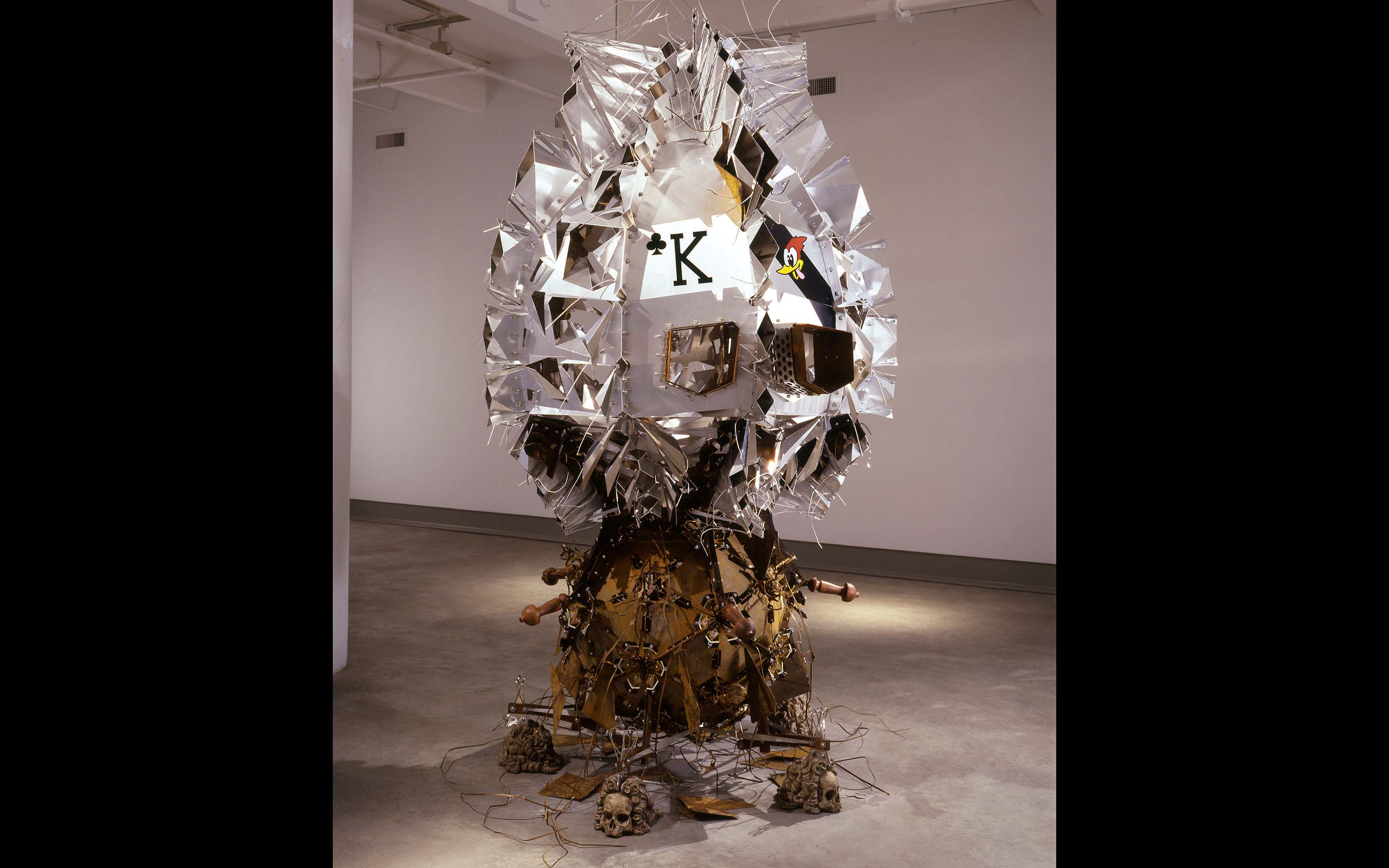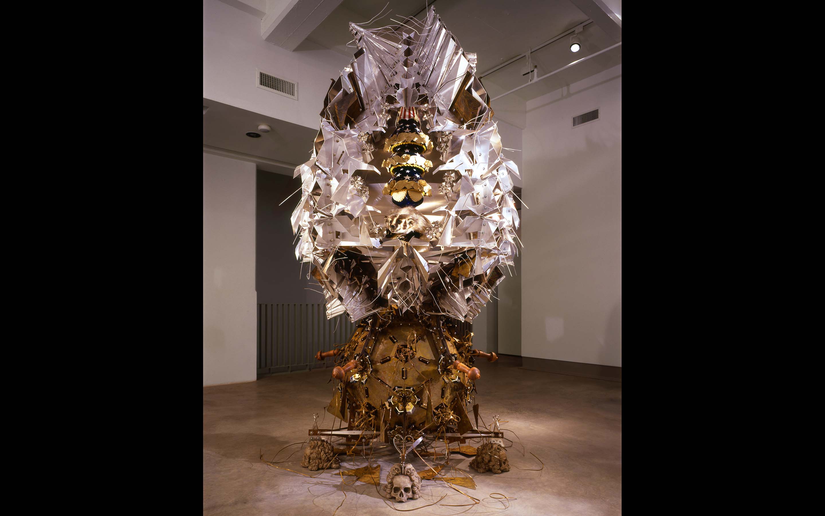 Crown Jewel Stolen from the King of Hell, 2004. Installation curated by Lily Wei for exhibition at the Cue Foundation, New York, NY. Dimensions: 126 x 65 x 71 inches. Material: steel, aluminum, concrete, ceramic, vinyl, neoprene, plastic, badger. Lead assistants: Paul Gabrielli, Yasuko Shingu. Assistants: Harold Jensen, Emily Silver. Skull Modeling: Paul Gabrielli. Ceramic Guidance: Steve Montgomery. Photography: © Lydia Gould Bessler.