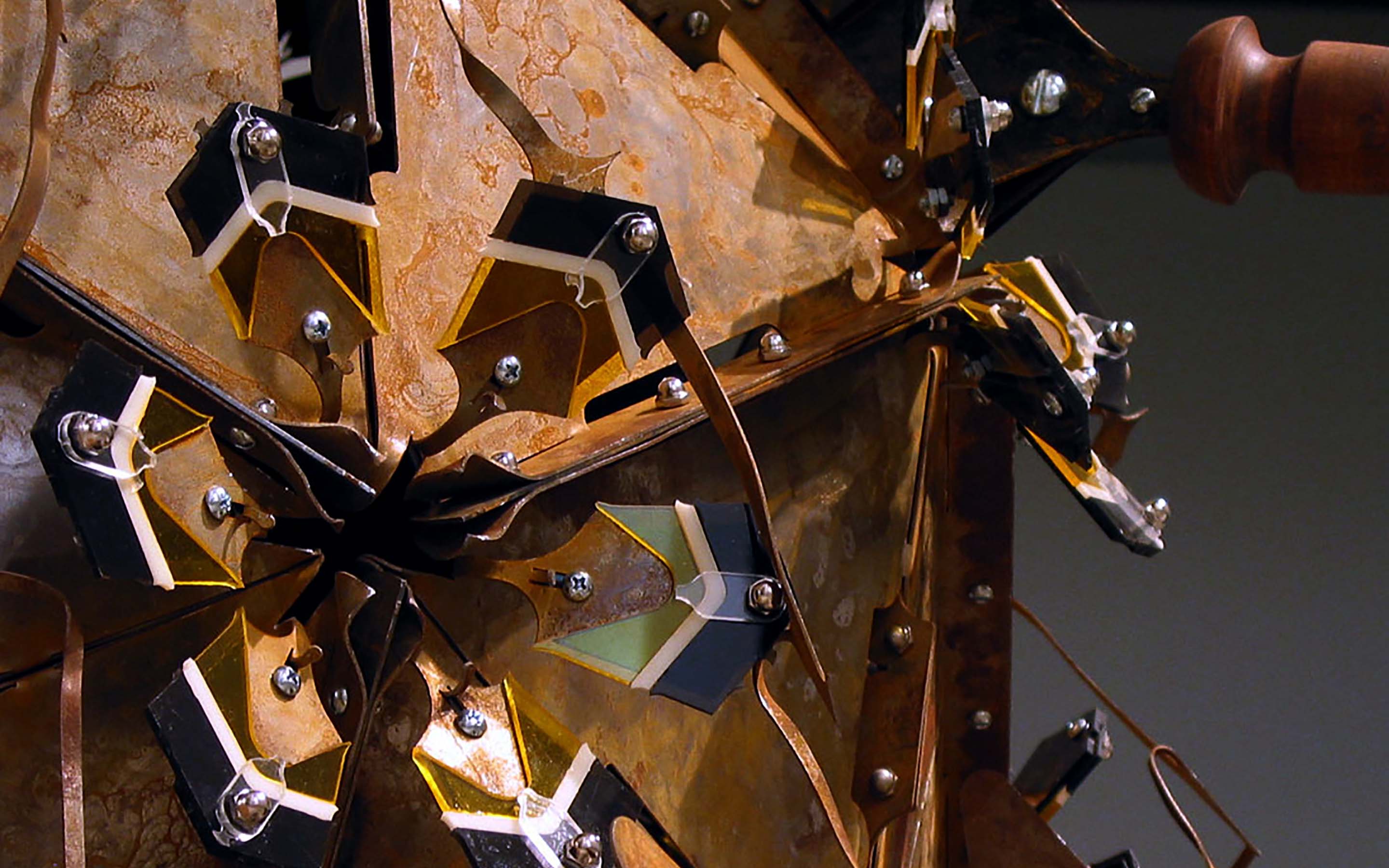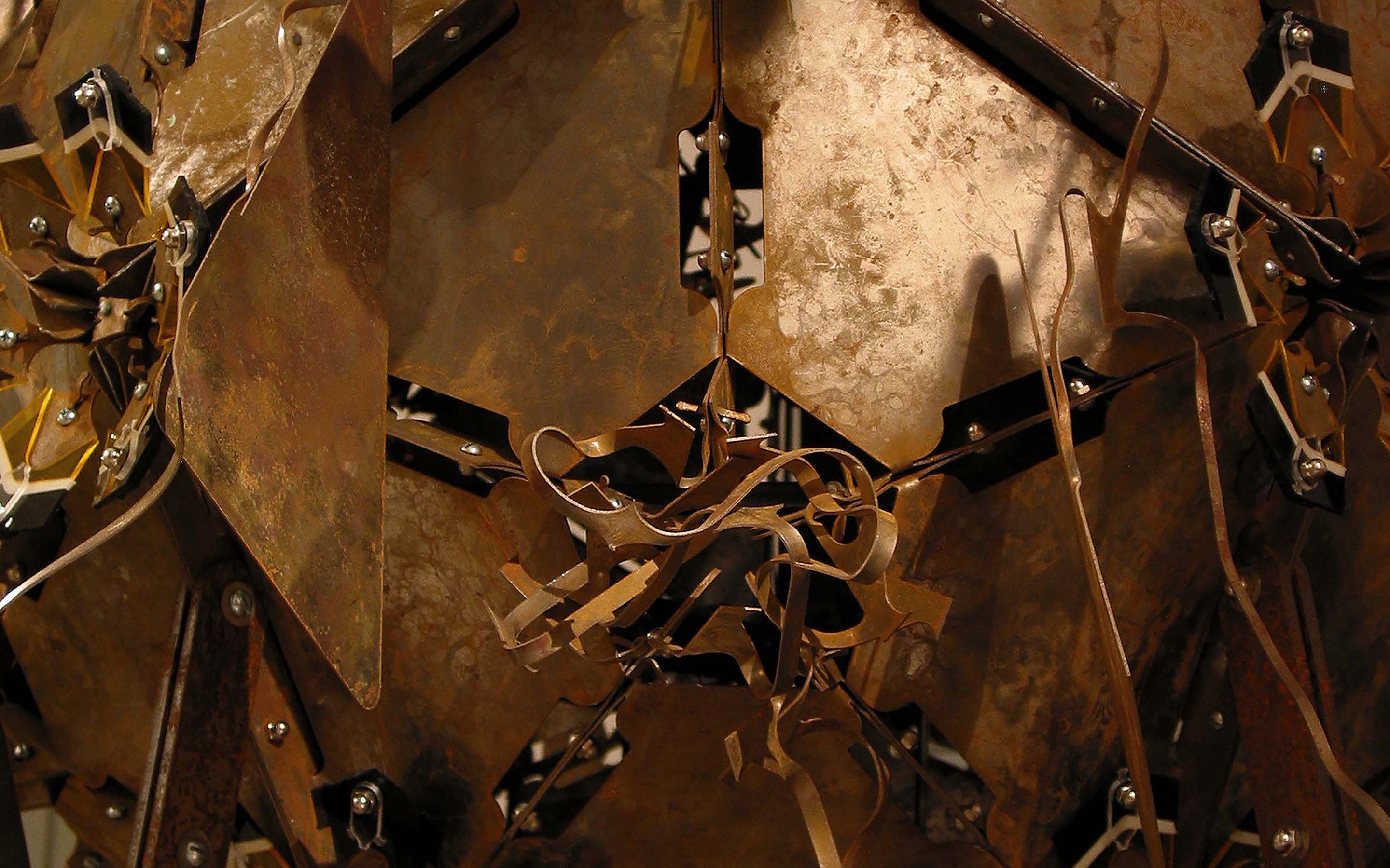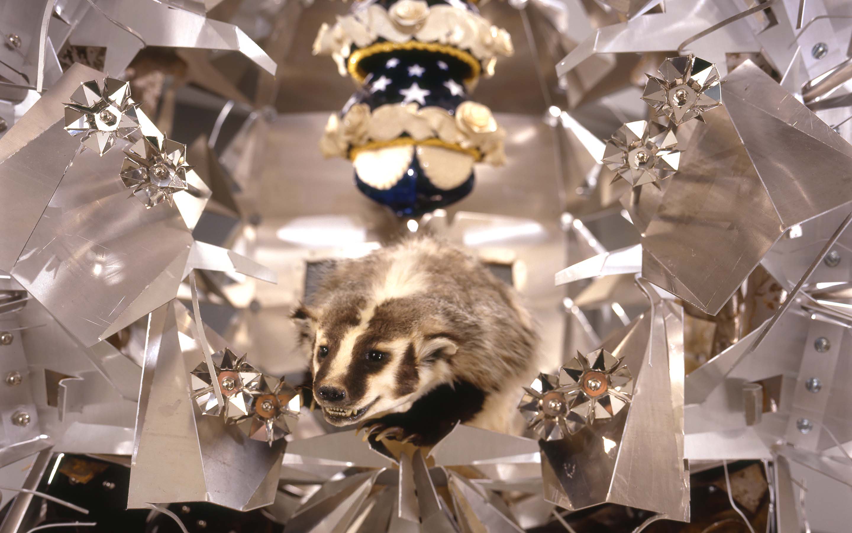 Crown Jewel Stolen from the King of Hell, 2004. Installation curated by Lily Wei for exhibition at the Cue Foundation, New York, NY. Dimensions: 126 x 65 x 71 inches. Material: steel, aluminum, concrete, ceramic, vinyl, neoprene, plastic, badger. Lead assistants: Paul Gabrielli, Yasuko Shingu. Assistants: Harold Jensen, Emily Silver. Skull Modeling: Paul Gabrielli. Ceramic Guidance: Steve Montgomery. Photography: © Lydia Gould Bessler.