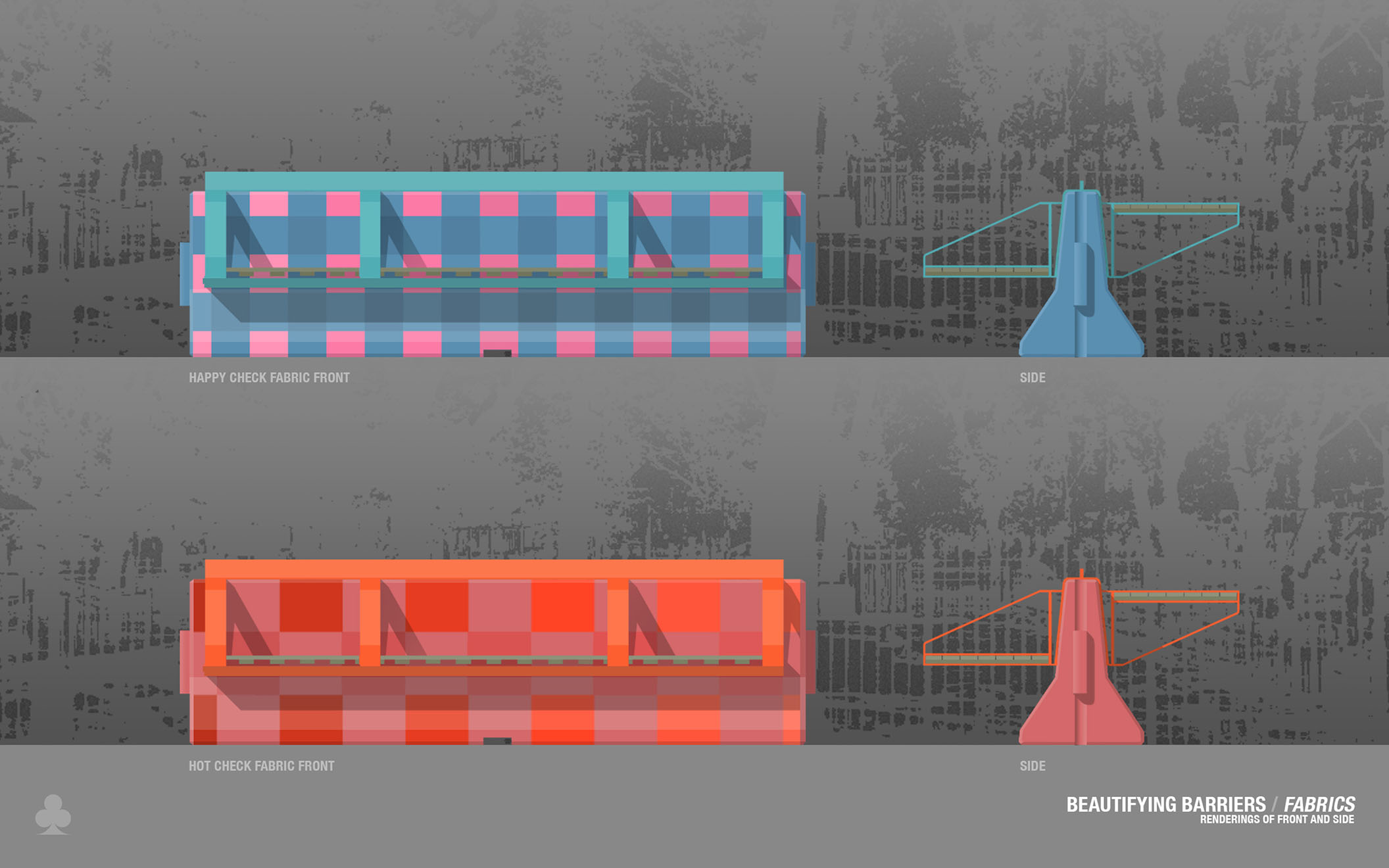 Fabrics: Beautifying Barriers, 2018. Design for painting new outdoor furniture in the Lower East Side, Manhattan. Dimensions: 123 x 23 x 24 inches each. Material: paint